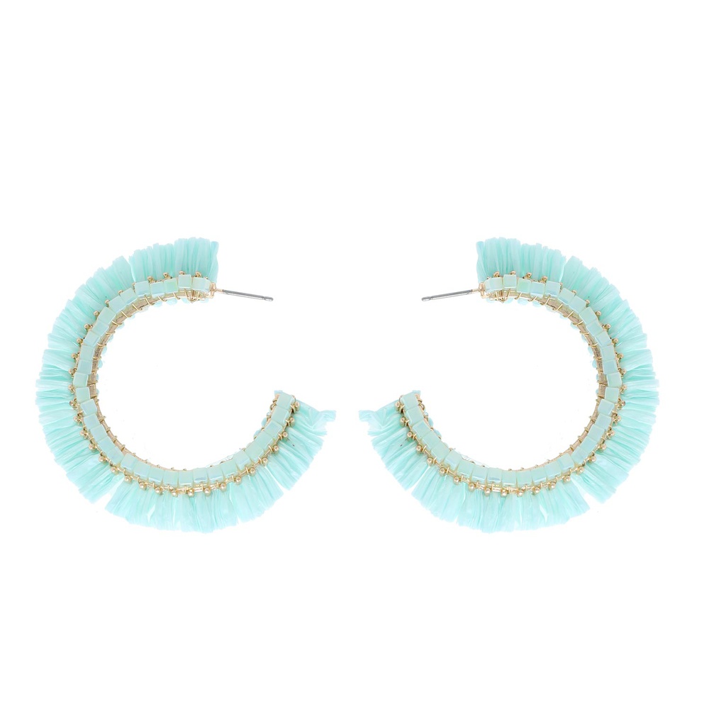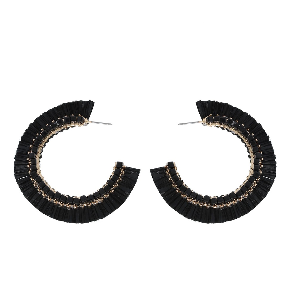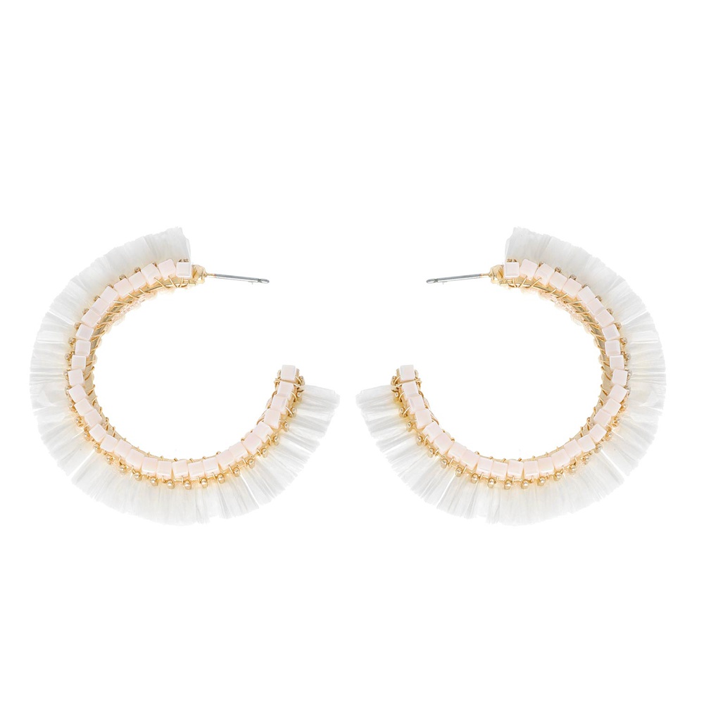 RAFFIA FRINGE BEADED OPEN HOOP EARRINGS IN GOLD TONE METAL
