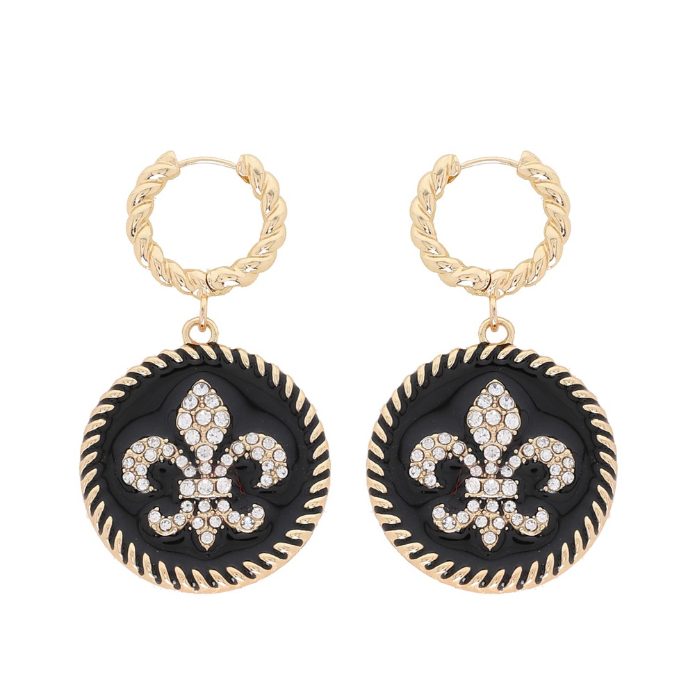 FLEUR DE LIS CRYSTAL RHINESTONE PAVE ENAMEL COATED CHARM HOOP EARRINGS
