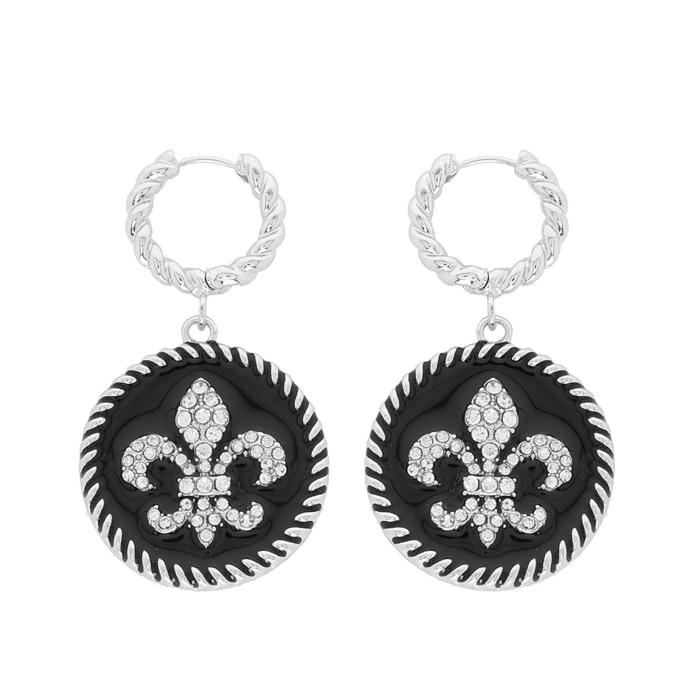 Jeweled Enamel Fleur De Lis Charm Hoop Earrings