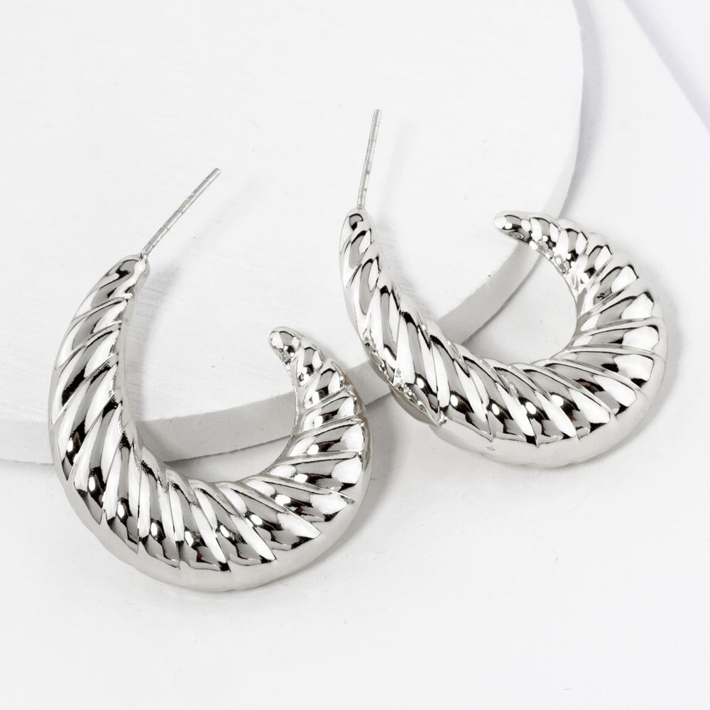 TEXTURED HOOP EARRINGS IN WHITE GOLD PLATING WITH STERLING SILVER POST