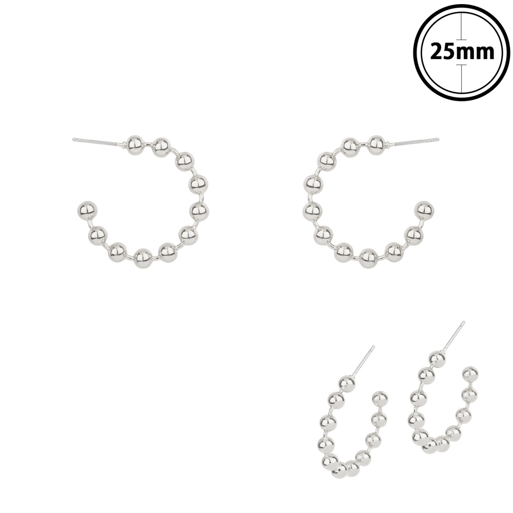 BALL BEADED OPEN HOOP POST EARRINGS IN SILVER TONE METAL (25MM)
