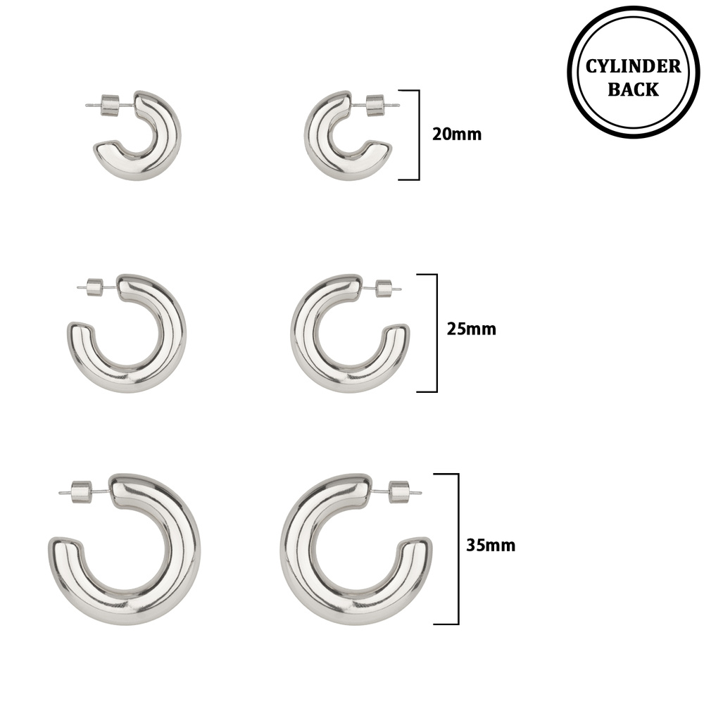 3 PAIR C-SHAPE HOOP EARRING SET WITH CYLINDER BACKINGS IN SILVER TONE METAL