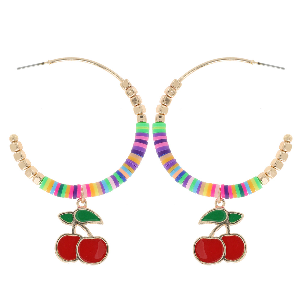 MULTI BEAD CHERRY CHARM OPEN HOOP EARRINGS