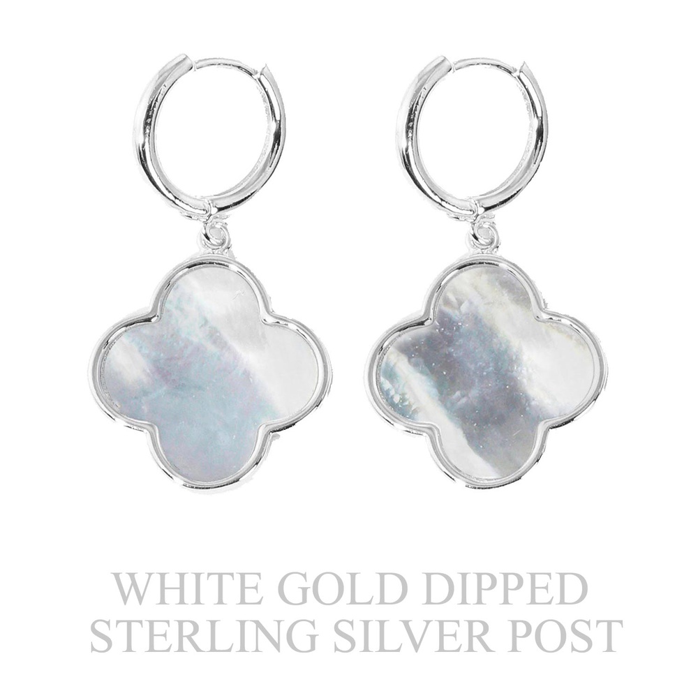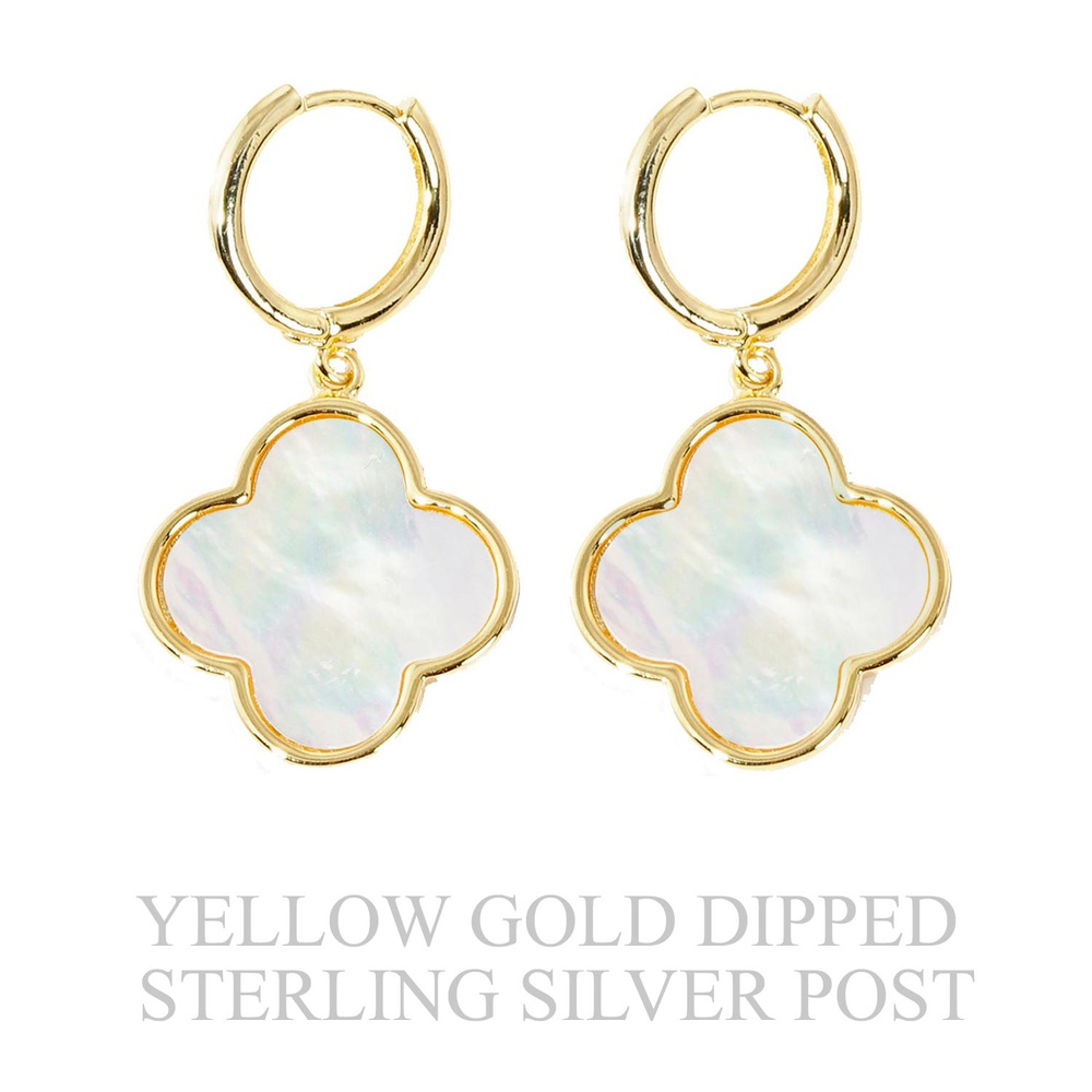 GOLD PLATED MOTHER OF PEARL QUATREFOIL HOOP CHARM EARRINGS