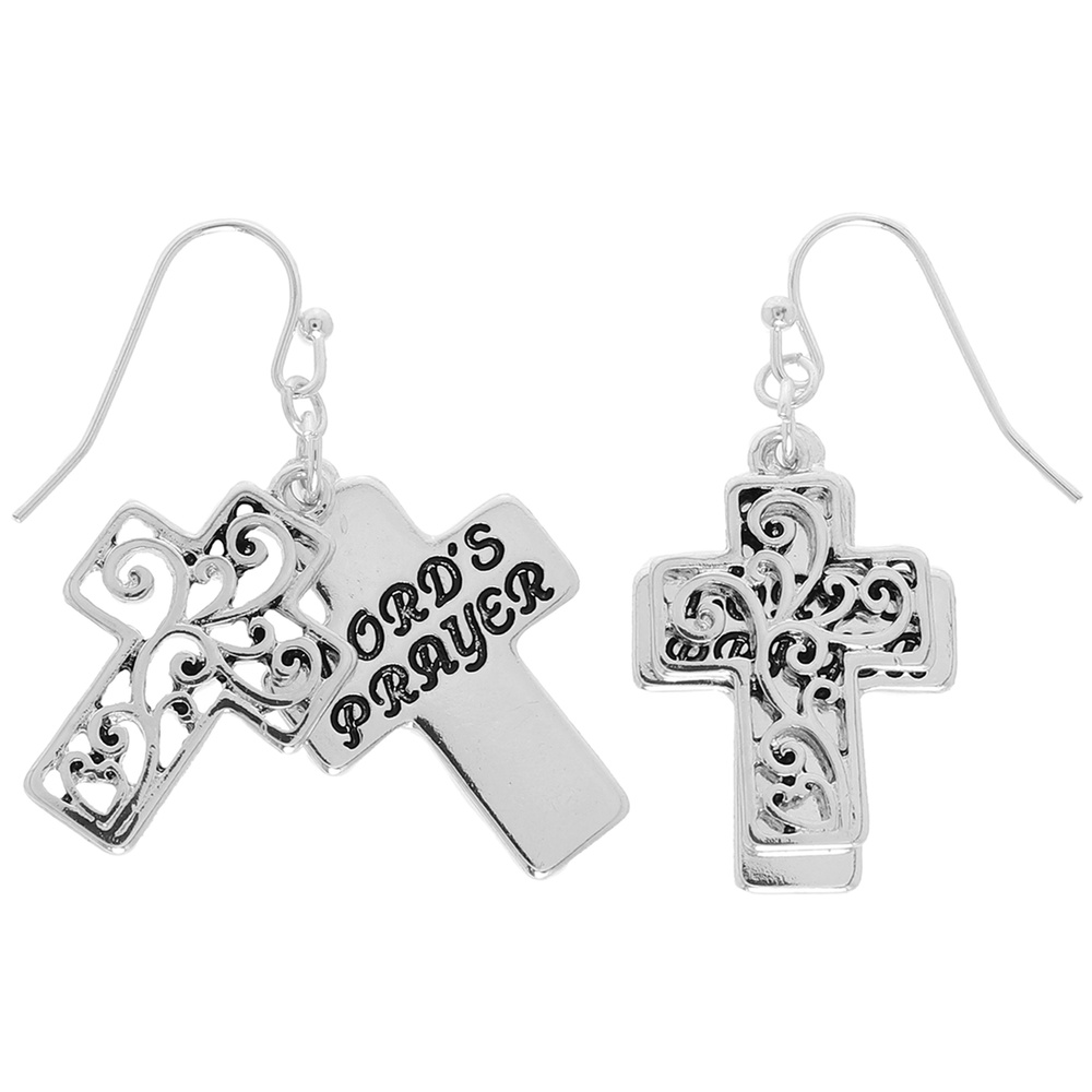 LORD'S PRAYER INSCRIBED FILIGREE CROSS DANGLE EARRINGS