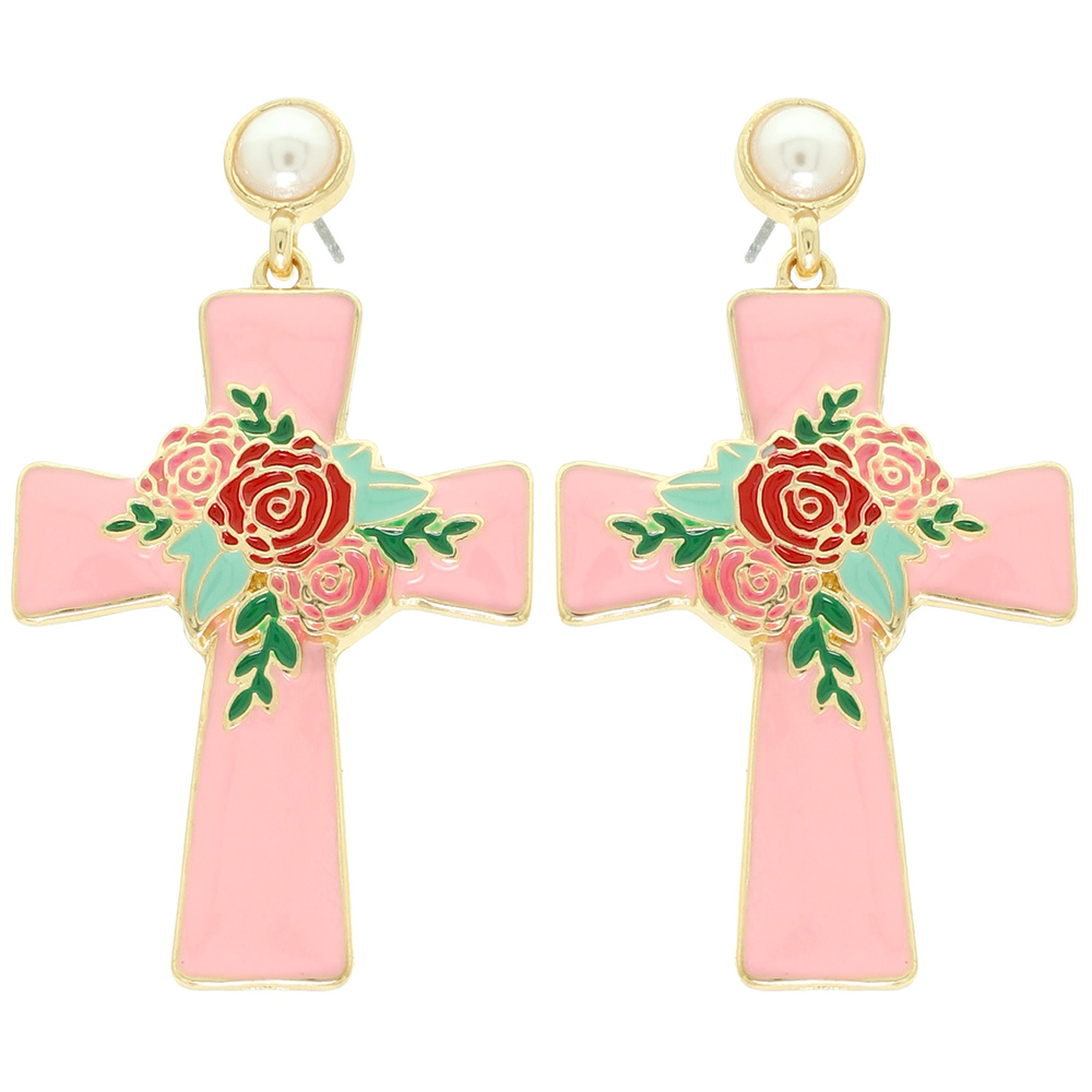 PEARL EMBELLISHED PASTEL COLOR ENAMEL ROSE CROSS POST DANGLE EARRINGS