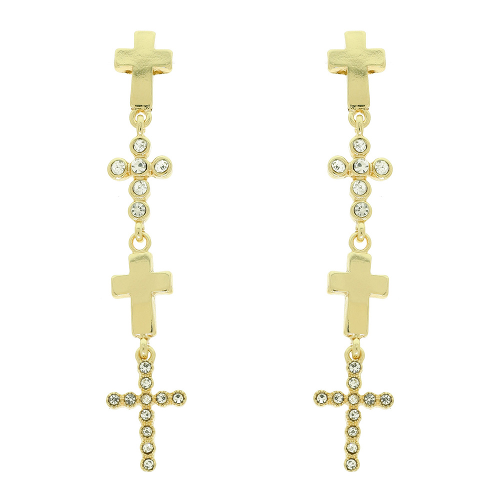 MULTI-CROSS LINEAR EARRINGS WITH PAVED RHINESTONES IN GOLD-TONE METAL