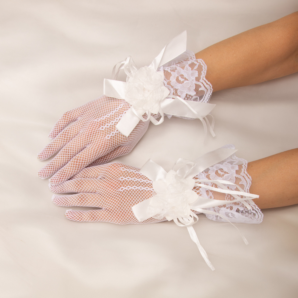 BRIDAL FISHNET WRIST LENGTH GLOVES FEATURING ORGANZA ROSETTE AND LACE TRIM CUFF