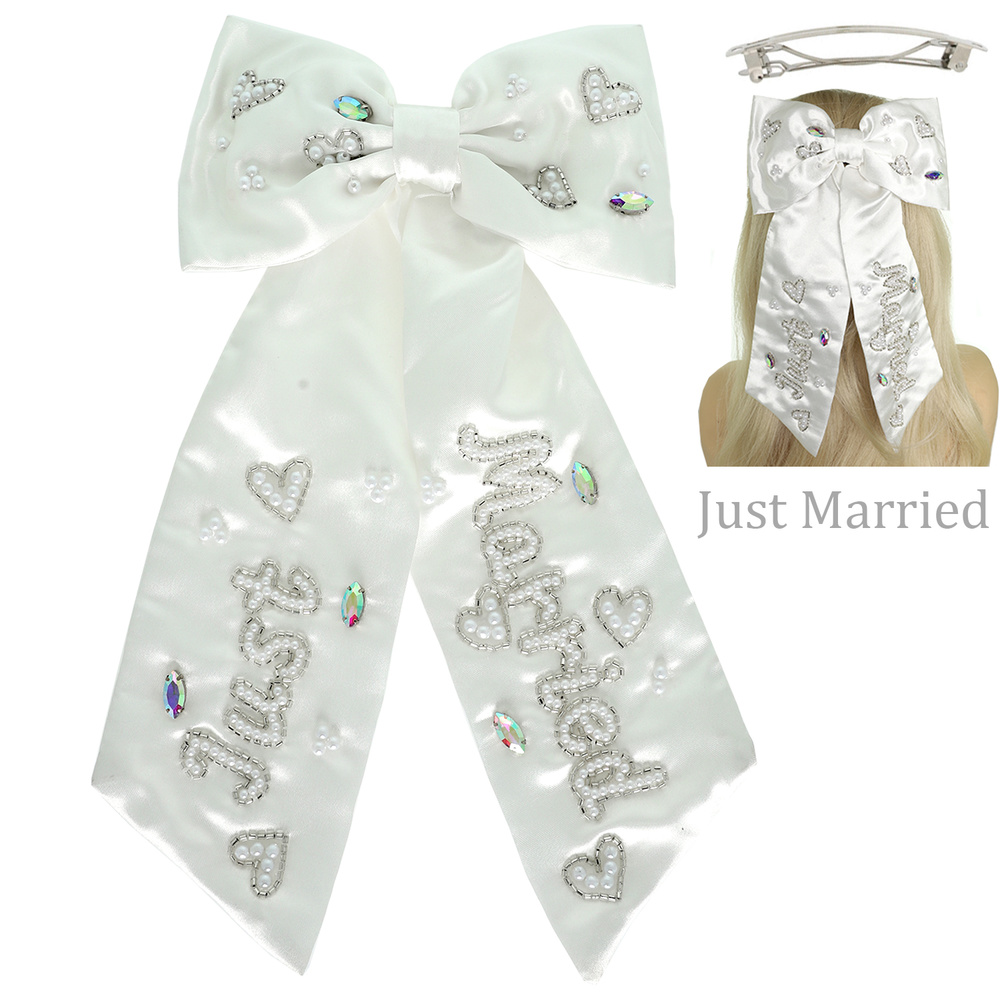 "JUST MARRIED" PEARL GEMSTONE EMBROIDERED BOW BARRETTE HAIR CLIP