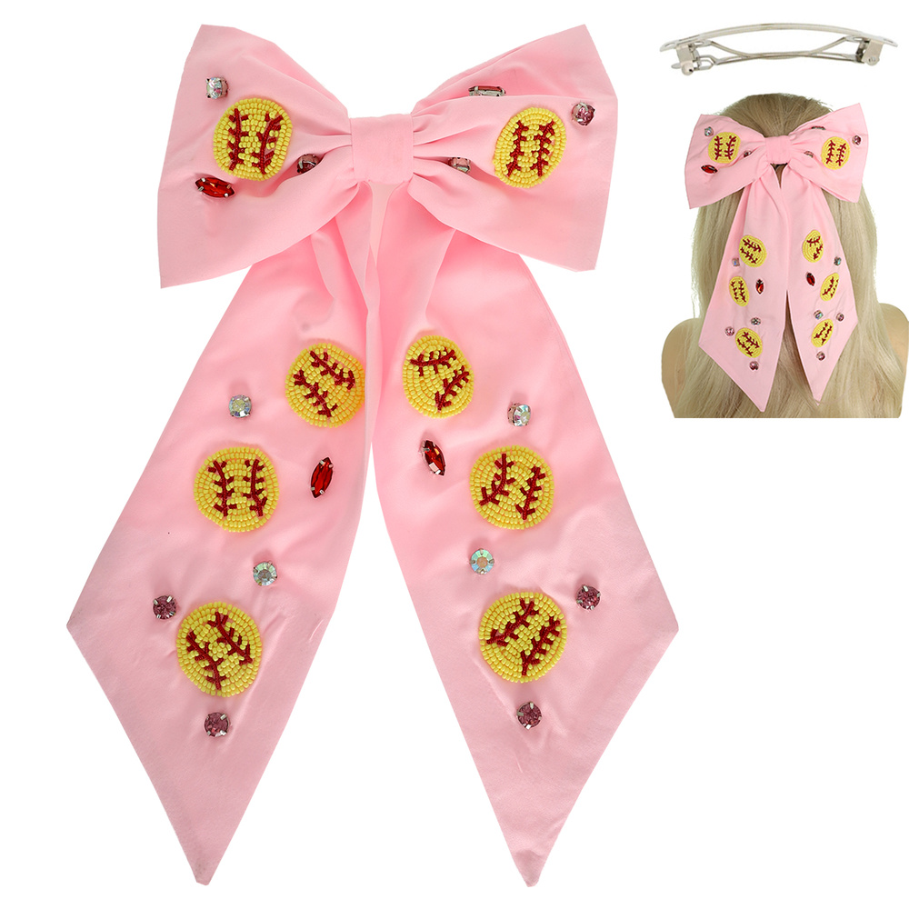 SOFTBALL BEAD GEMSTONE EMBROIDERED BOW BARRETTE HAIR CLIP