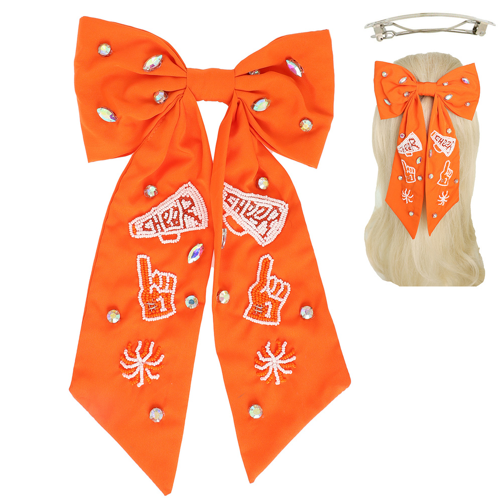 GAME DAY "CHEER" BEAD GEMSTONE EMBROIDERED BOW BARRETTE HAIR CLIP