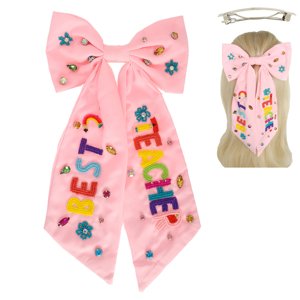 "BEST TEACHER" LETTER BEADED GEMSTONE EMBROIDERED BOW BARRETTE HAIR CLIP
