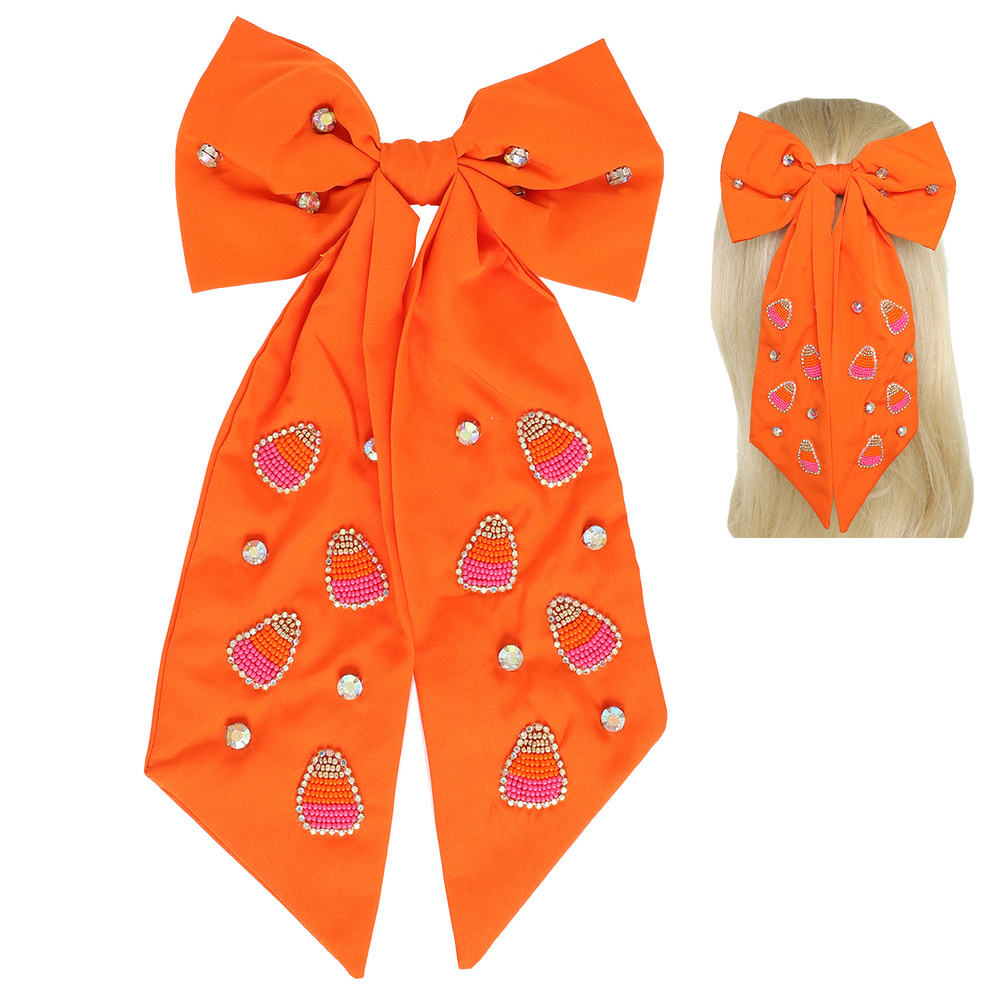 HALLOWEEN CANDY CORN GEMSTONE BEAD EMBELLISHED BOW BARRETTE HAIR CLIP