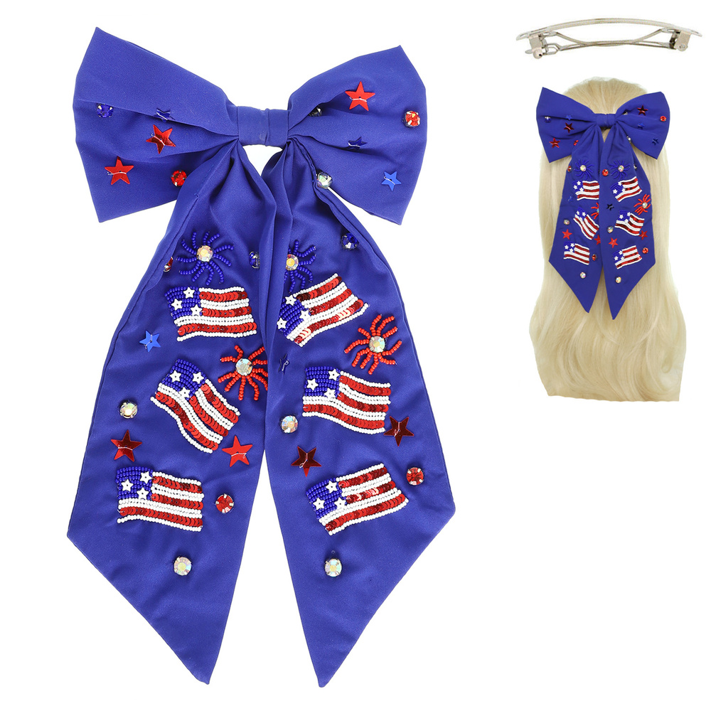 USA FLAG THEME CRYSTAL SEQUINS BEAD EMBELLISHED BOW BARRETTE HAIR CLIP