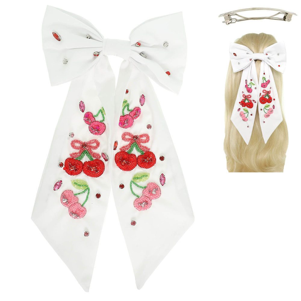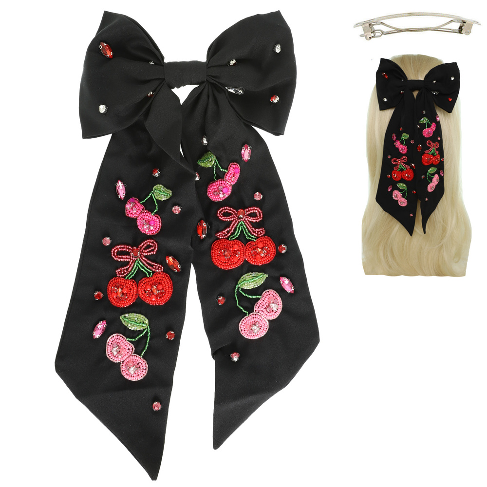 CHERRY THEME CRYSTAL SEED BEAD EMBELLISHED BOW BARRETTE HAIR CLIP