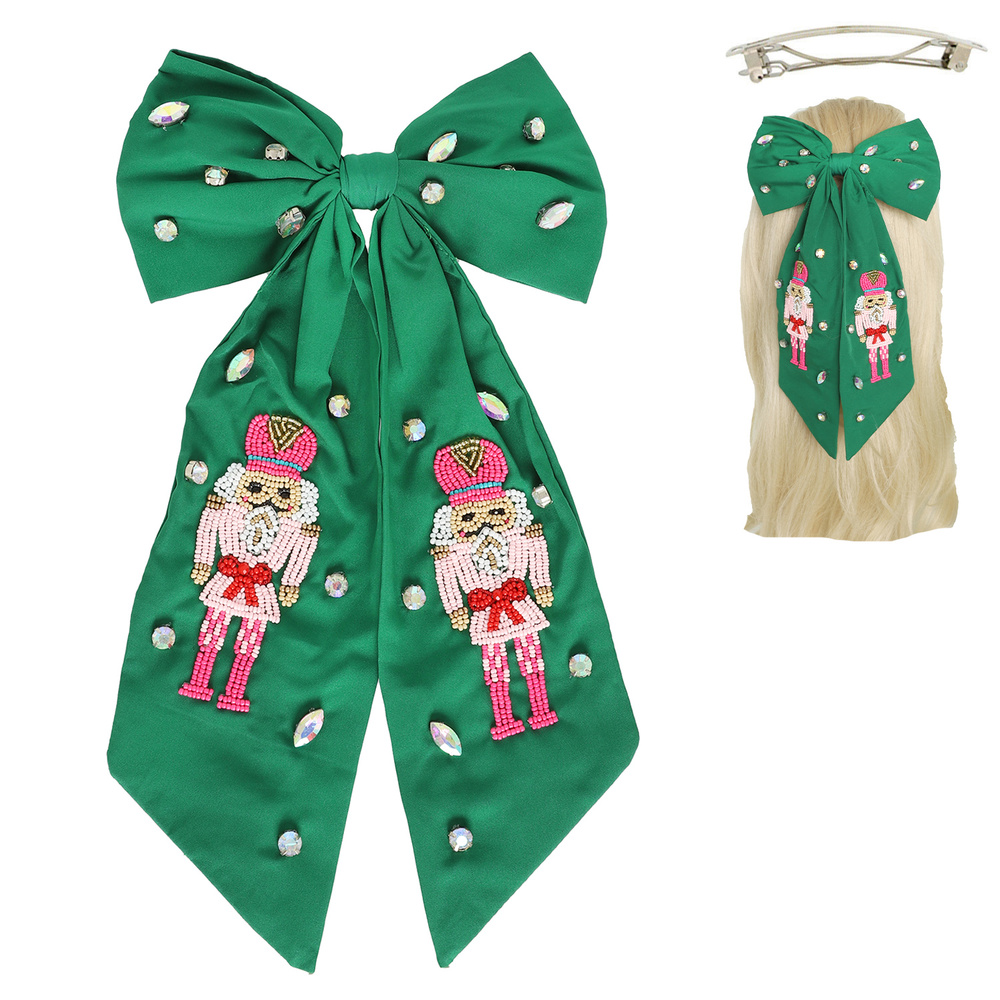 CHRISTMAS NUTCRACKER CRYSTAL BEAD EMBROIDERED BOW BARRETTE HAIR CLIP