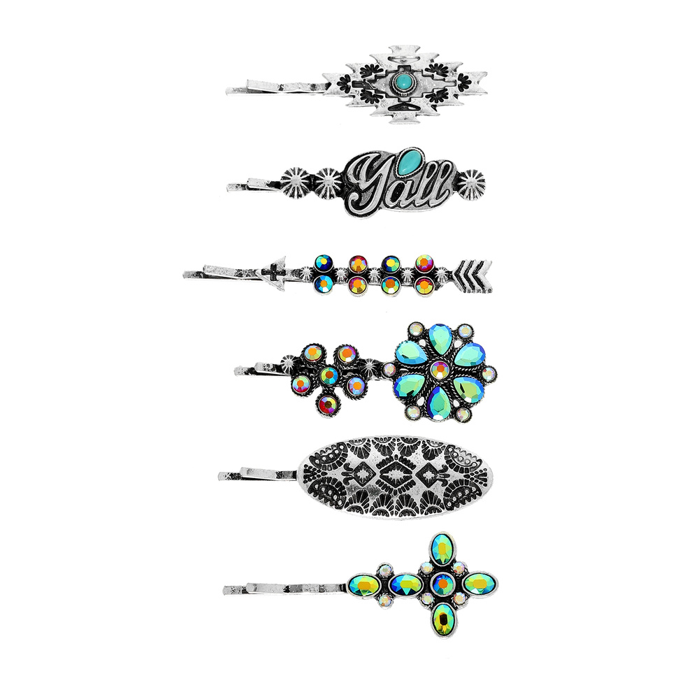 6-PIECE WESTERN INSPIRED ASSORTED TURQUOISE CRYSTAL HAIR PIN SET