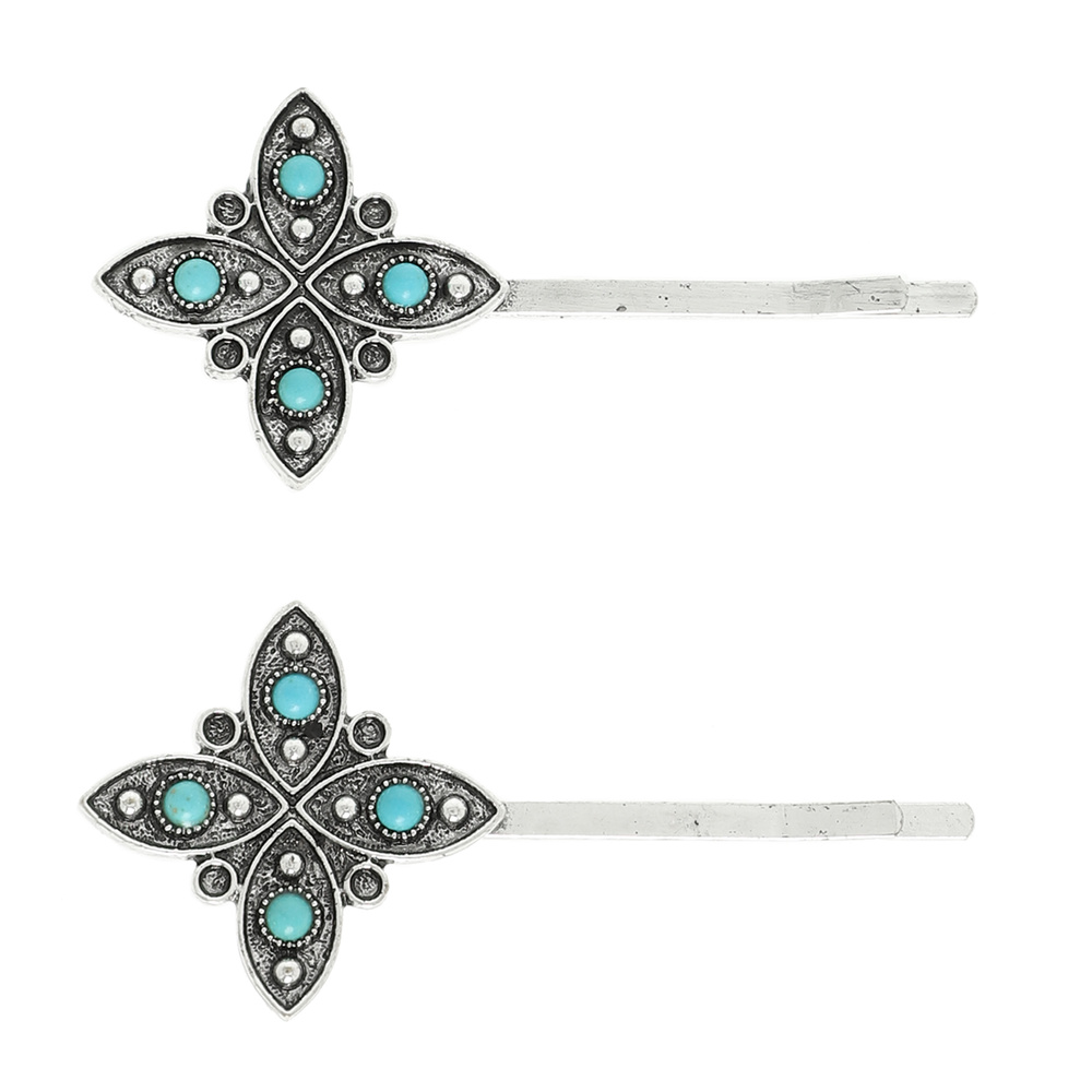 2-PACK TURQUOISE FLOWER BOBBY HAIR PIN SET IN OXIDIZED SILVER-TONE METAL
