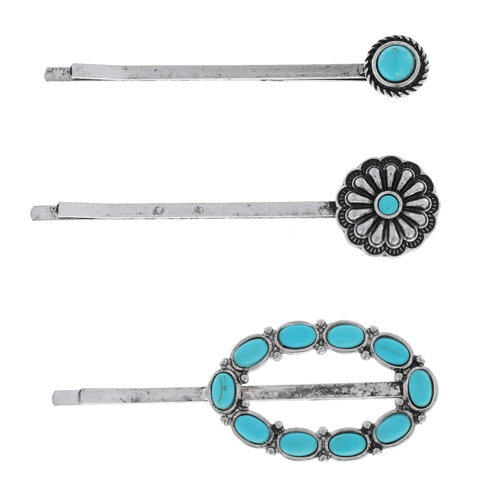 Open Oval- 3-piece Assorted Set Decorative Western Turquoise Semi Stone Bobby Pin Hair Pins