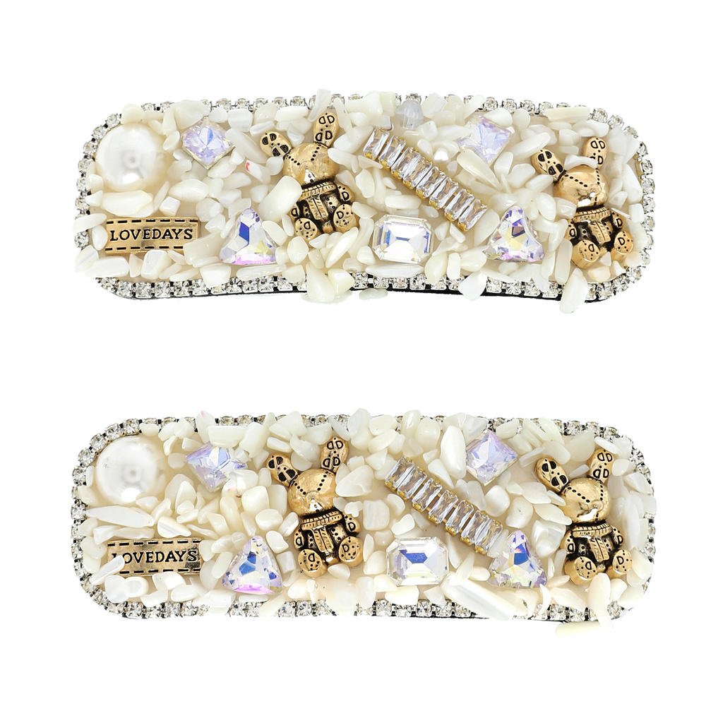 2-PACK MATCHING BUNNY "LOVEDAYS" METAL TAG CRYSTAL GEMSTONE CLUSTER EMBELLISHED SNAP HAIR CLIP SET