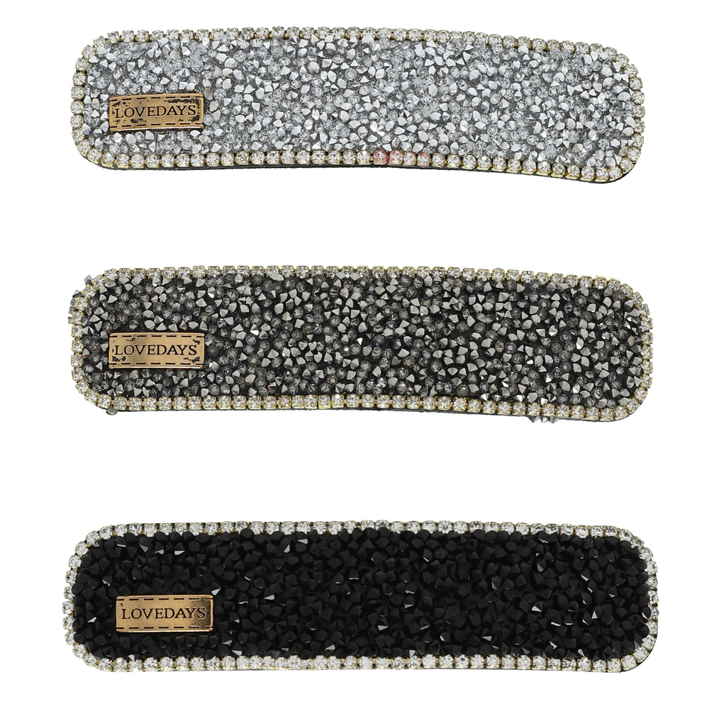 3-PACK ASSORTED "LOVEDAYS" METAL TAG CRYSTAL RHINESTONE SNAP HAIR CLIP SET