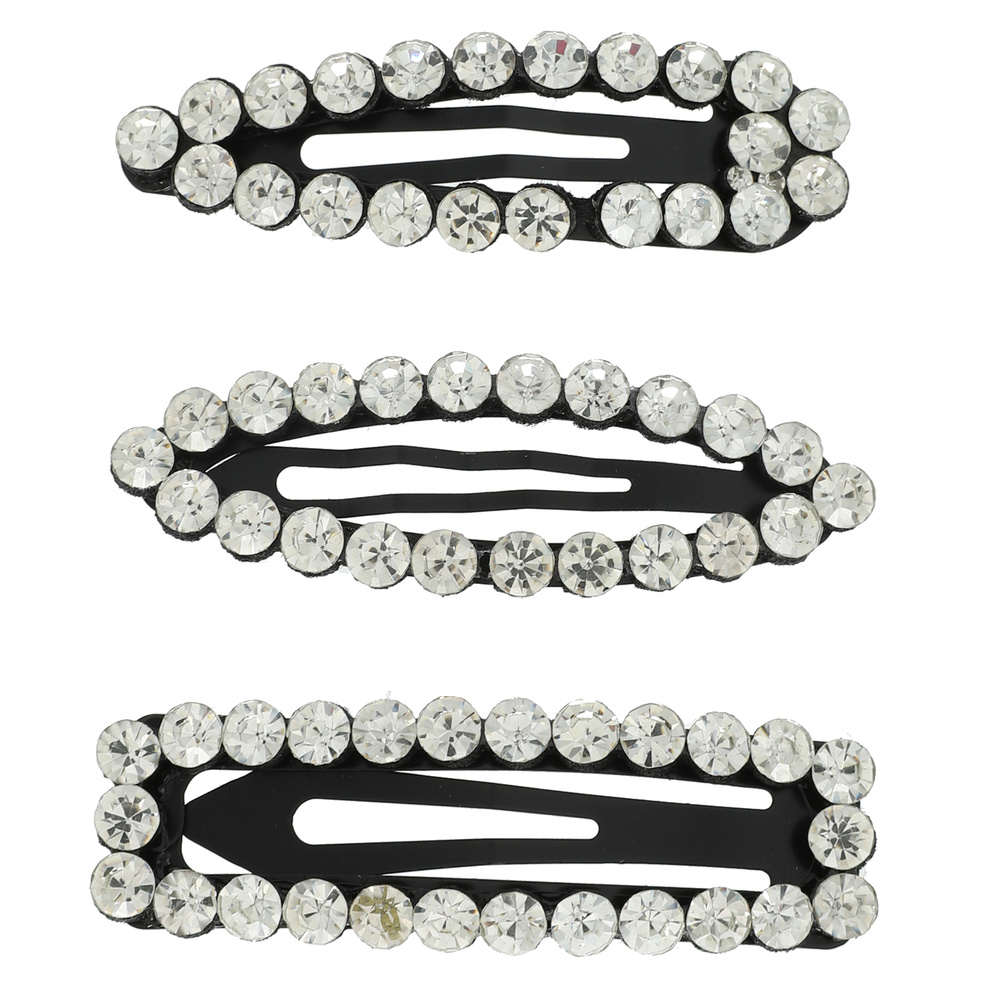 3-PACK ASSORTED CRYSTAL RHINESTONE SNAP HAIR CLIP SET IN BLACK TONE METAL