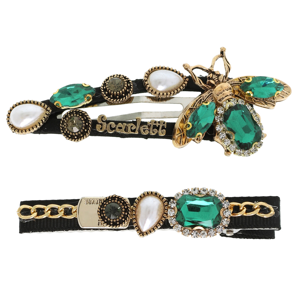 2-PACK ASSORTED SET ANTIQUE HONEY BEE CHAIN LINK CRYSTAL GEMSTONE SNAP HAIR CLIP AND ALLIGATOR STYLE HAIR CLIP IN OXIDIZED GOLD TONE METAL