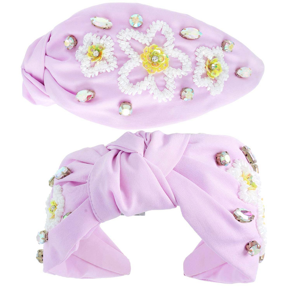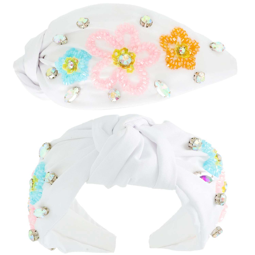 Floral Crystal Gemstone Beaded Sequin Embellished Knotted Headband Width: 3" Height: 6.5"