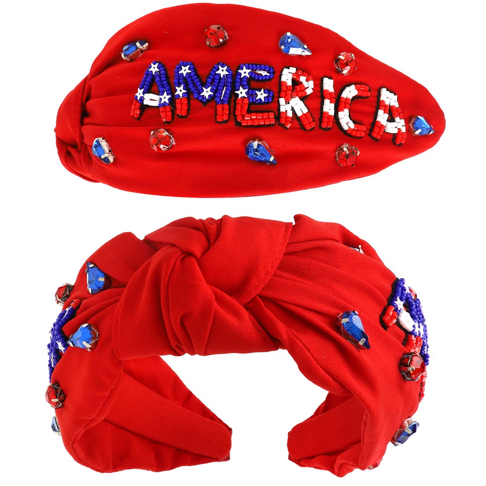 "AMERICA" PATRIOTIC USA CRYSTAL RHINESTONE BEADED EMBROIDERY KNOTTED LETTERING HEADBAND