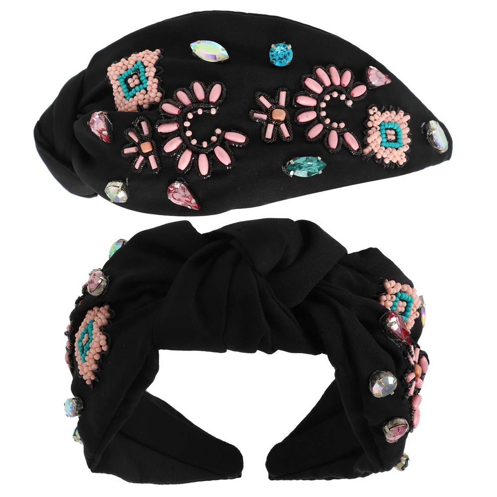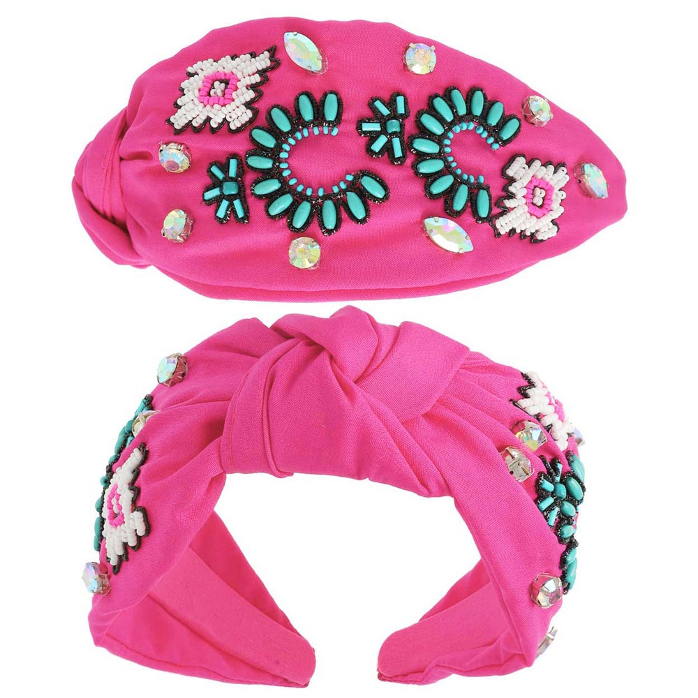 WESTERN TURQUOISE STONE SQUASH BLOSSOM CRYSTAL GEMSTONE BEADED AZTEC DESIGN TOP KNOTTED HEADBAND