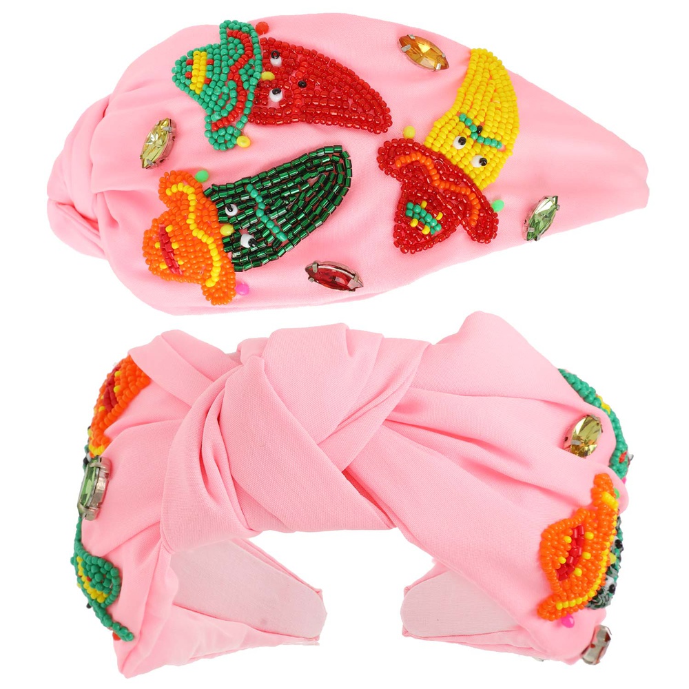 FIESTA SOMBRERO CHILI PEPPERS BEADED EMBROIDERY CRYSTAL GEMSTONE EMBELLISHED LETTERING TOP KNOTTED HEADBAND