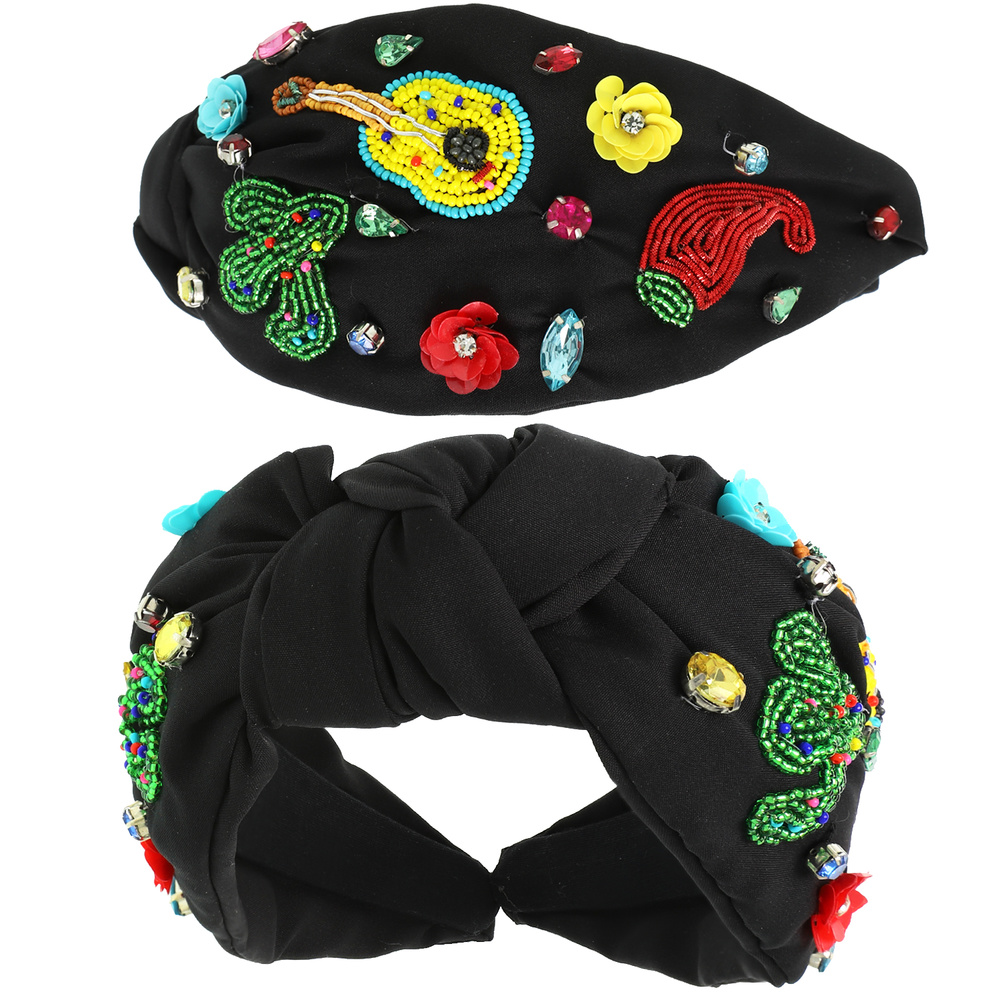 CINCO DE MAYO CONFETTI FIESTA CHILI PEPPERS GUITAR CACTUS BEADED EMBROIDERY CRYSTAL GEMSTONE SEQUIN TOP KNOTTED HEADBAND