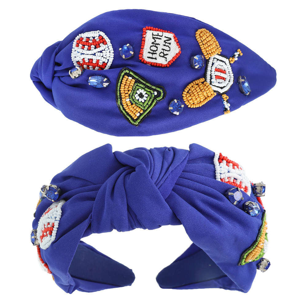 BASEBALL THEMED CRYSATL GEMSTONE BEADED EMBROIDERY STITCHED TOP KNOTTED HEADBAND