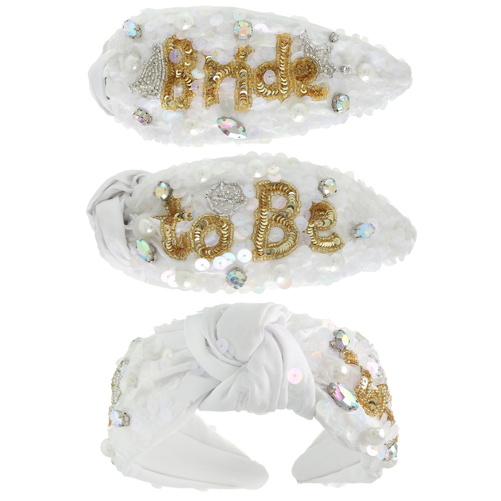 "BRIDE TO BE" SEQUIN PEARL BEAD GEMSTONE EMBROIDERED TOP KNOTTED HEADBAND