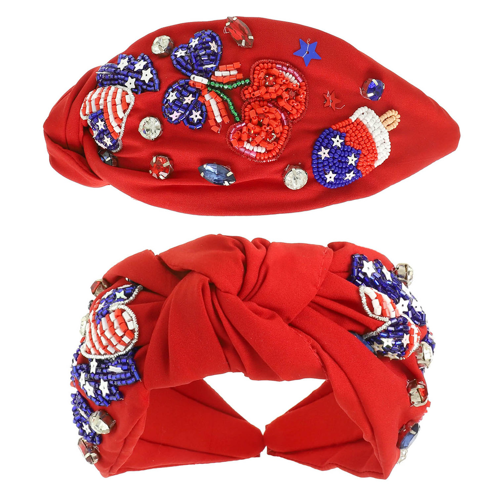 U.S FLAG THEME CRYSTAL STAR SEQUINS SEED BEADED TOP KNOTTED HEADBAND