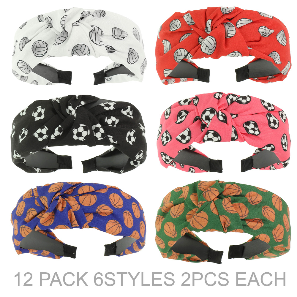 SPORTS BALL THEME PRINT TOP KNOTTED HEADBAND WITH SIX ASSORTED STYLES (12pc PACK)