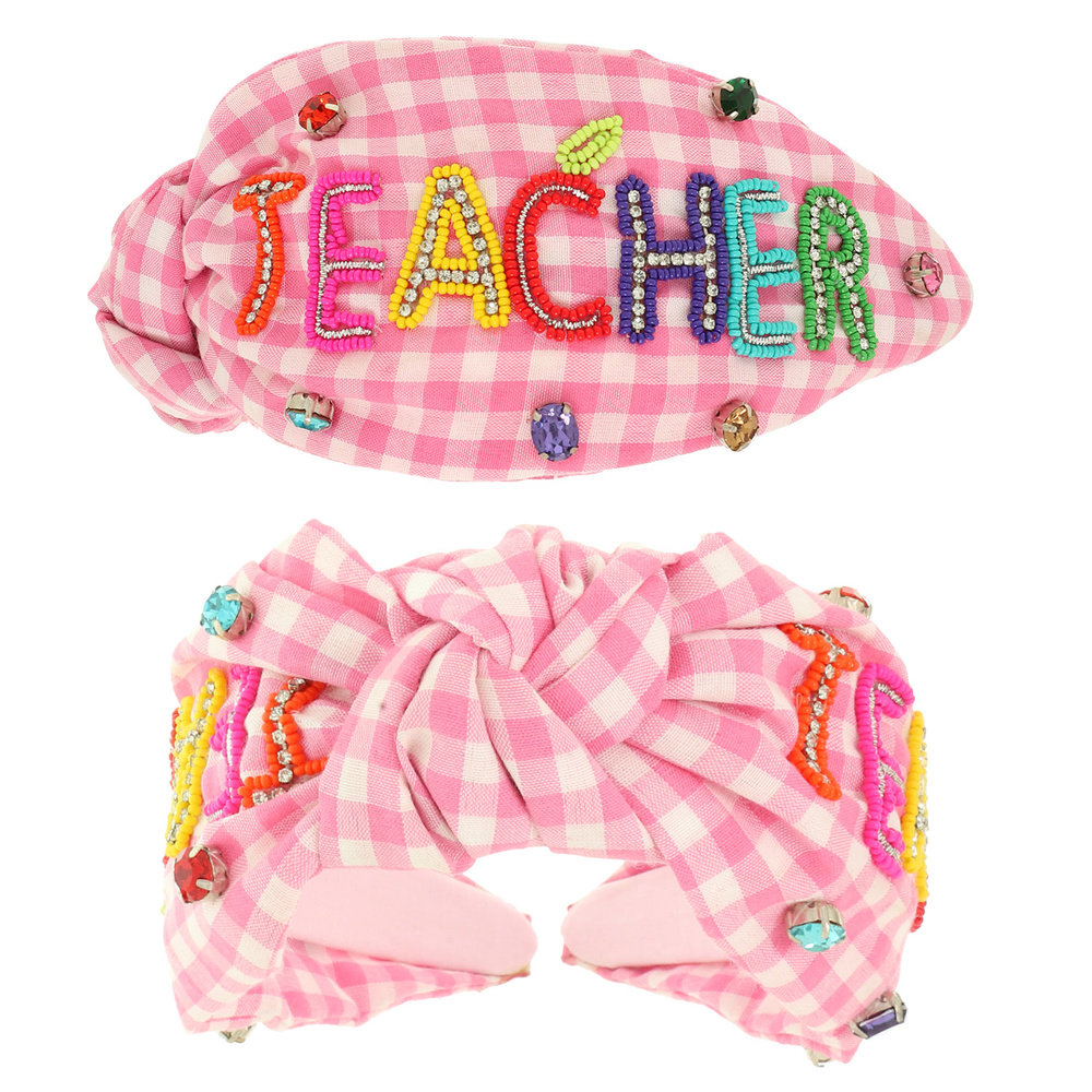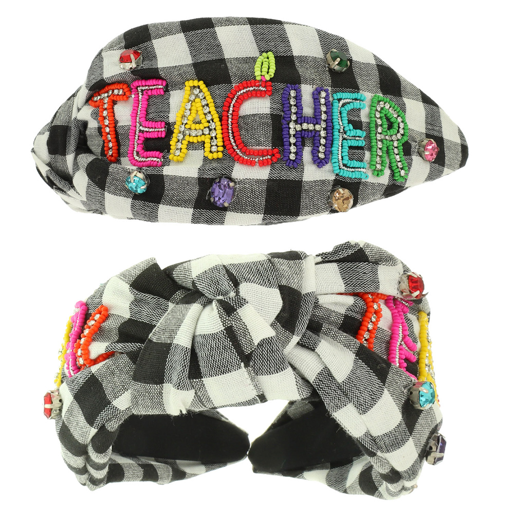 TEACHER SEED BEADED TOP KNOTTED GINGHAM STYLE HEADBAND WITH CRYSTAL ACCENTS