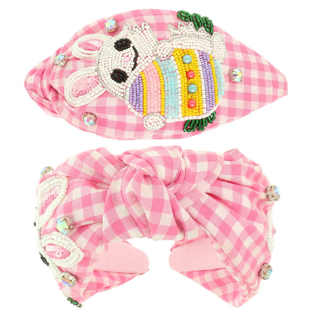 EASTER BUNNY WITH EGG SEED BEADED GINGHAM PATTERNED TOP KNOTTED HEADBAND