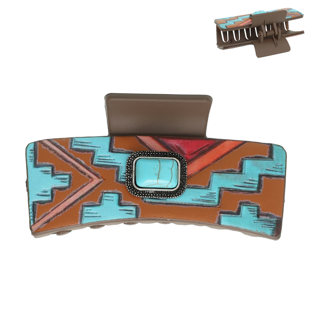 SOUTHWESTERN ZIG ZAG AZTEC GEOMETRIC DESIGN TURQUOISE CONCHO FAUX LEATHER PAINTED GRAPHIC CLAW HAIR CLIP