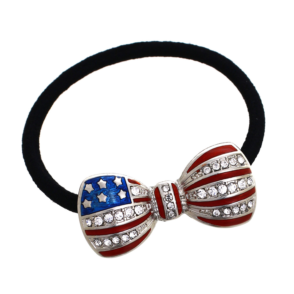 PATRIOTIC ENAMEL RHINESTONE AMERICAN FLAG BOW-TIE PONYTAIL HOLDER