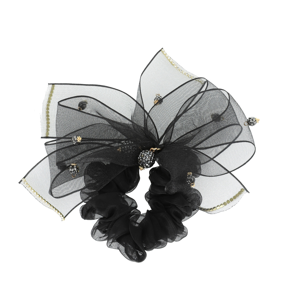 POLKA DOT CRYSTAL RHINESTONE SPHERE ACCENTED MESH BOW PONYTAIL BUN HAIR TIE SCRUNCHY