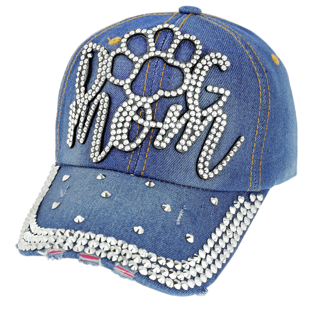Dog Mom With Dog Paw Rhinestone Distressed Denim Fashion Baseball Cap