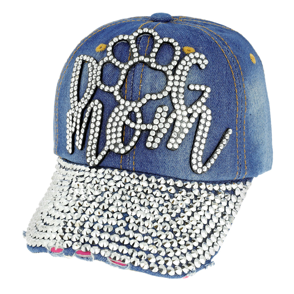 DOG MOM WITH DOG PAW RHINESTONE DISTRESSED DENIM FASHION BASEBALL CAP