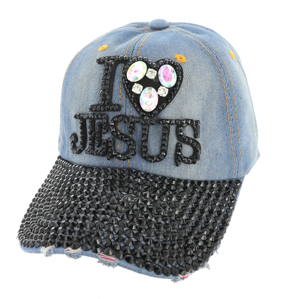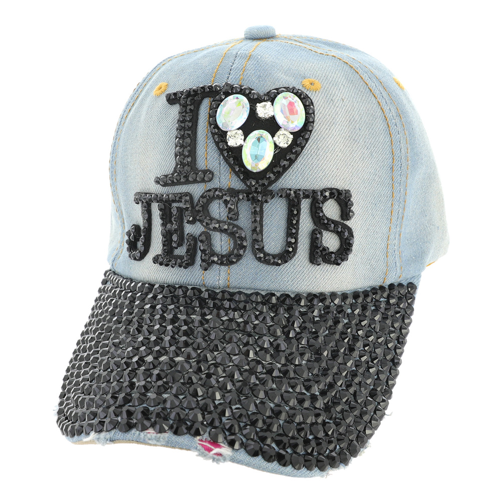 "i Love Jesus" Crystal Rhinestone Distressed Denim Jeweled Baseball Cap