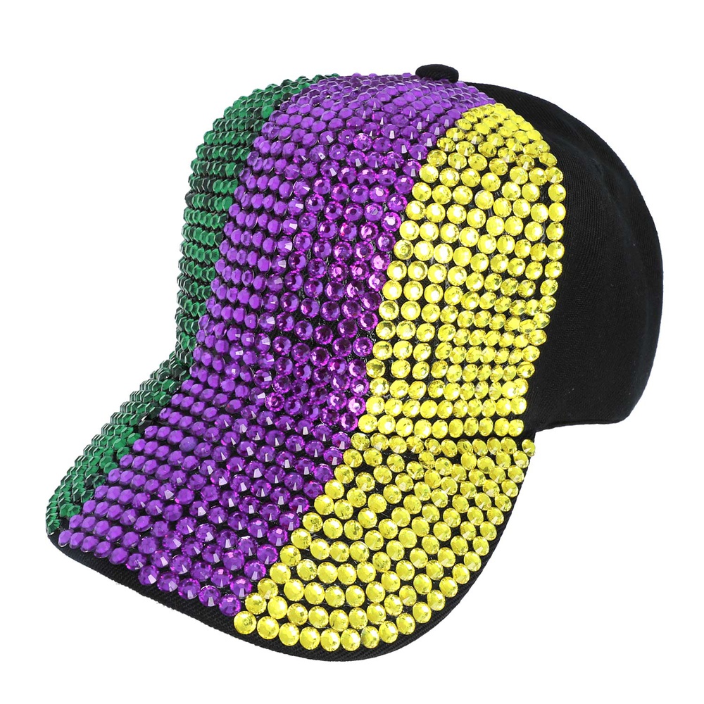 MARDI GRAS TRI COLOR STRIPED LIGHTWEIGHT BLING CRYSTAL RHINESTONE STUDDED FASHION BASEBALL CAP