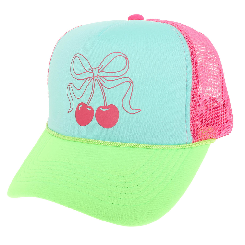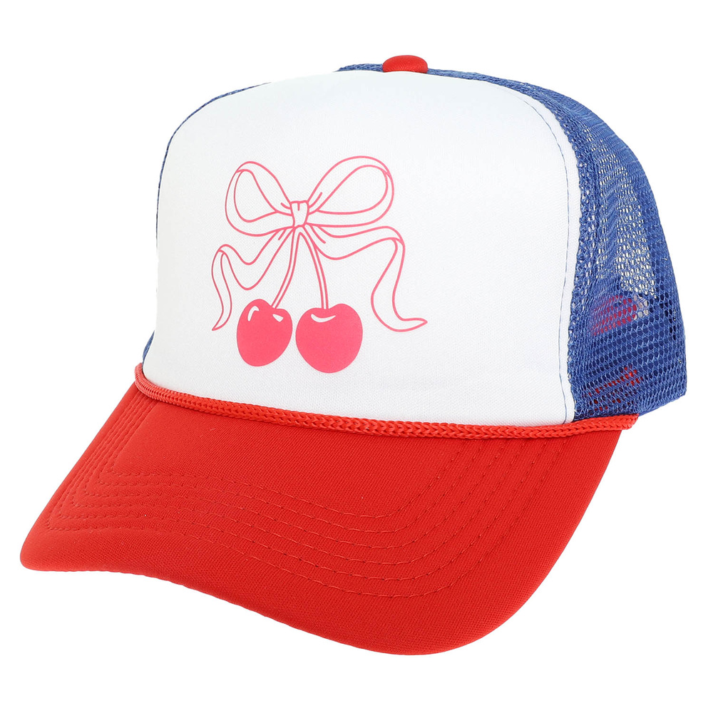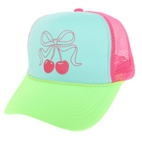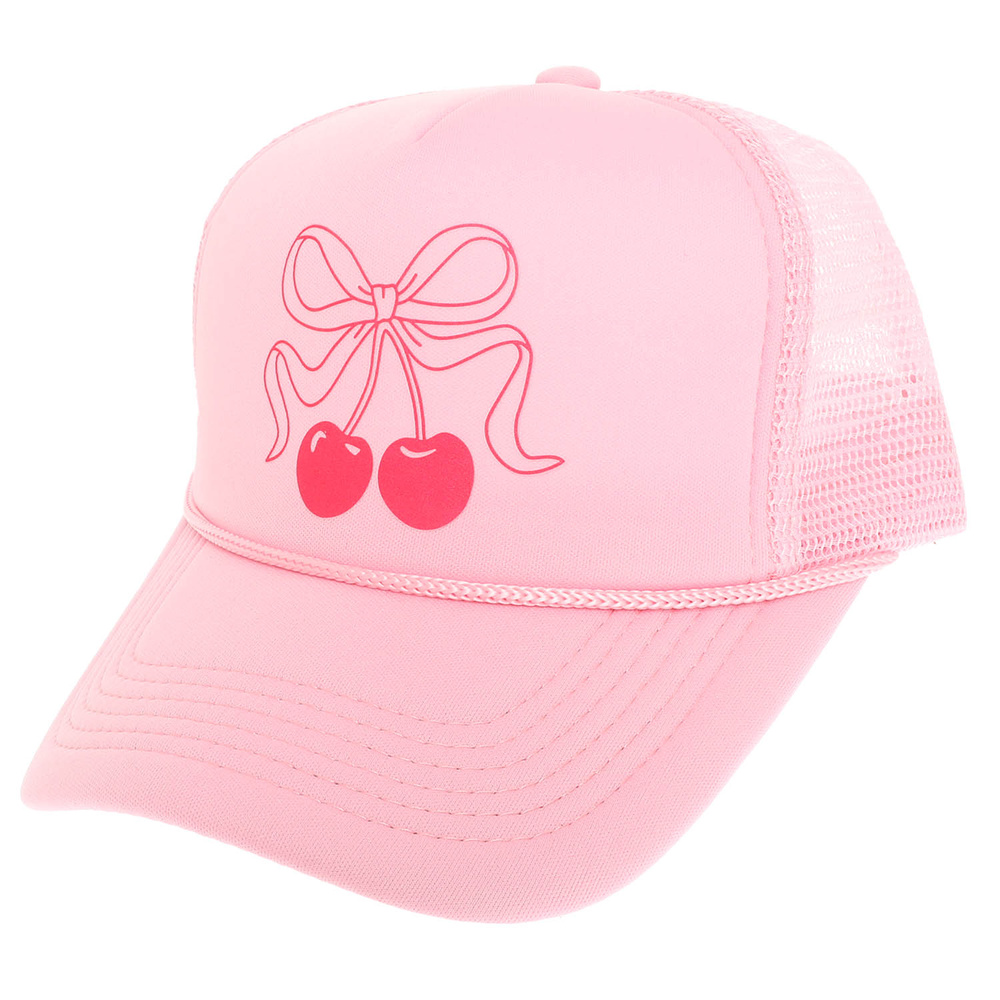 KNOTTED CHERRIES GRAPHIC PRINT FITTED TRUCKER HAT WITH SNAPBACK CLOSURE