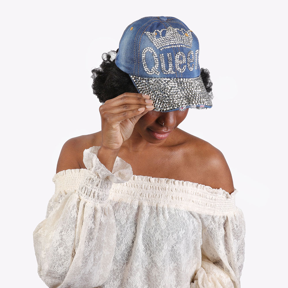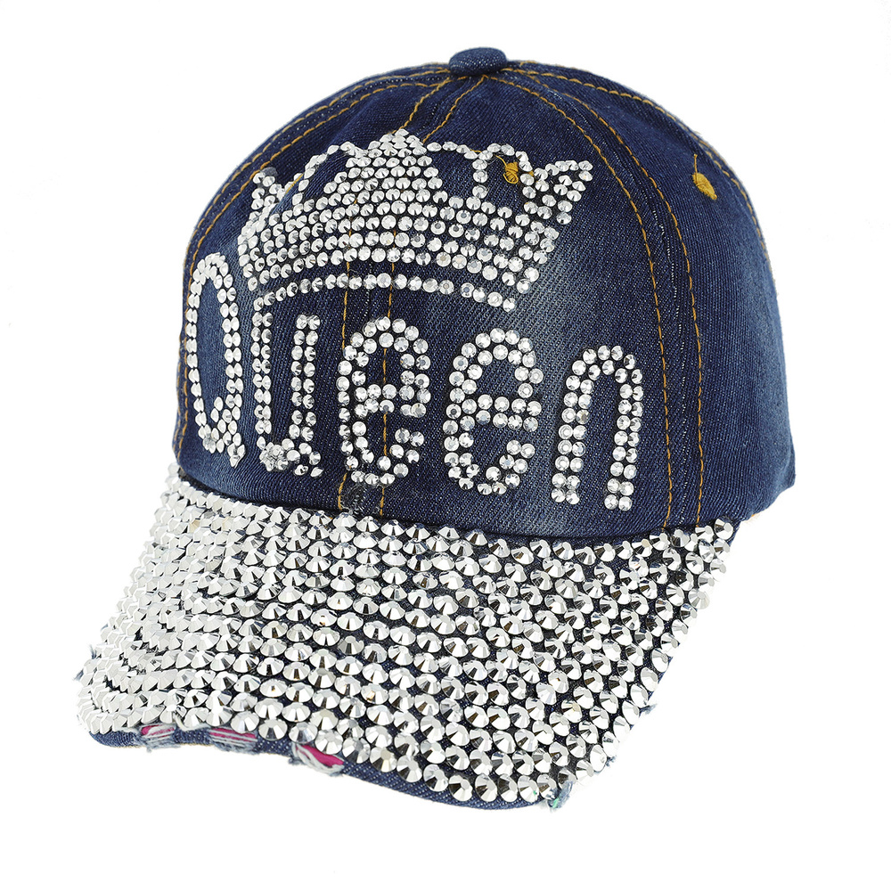 QUEEN WITH CROWN RHINESTONE DISTRESSED DENIM FASHION BASEBALL CAP