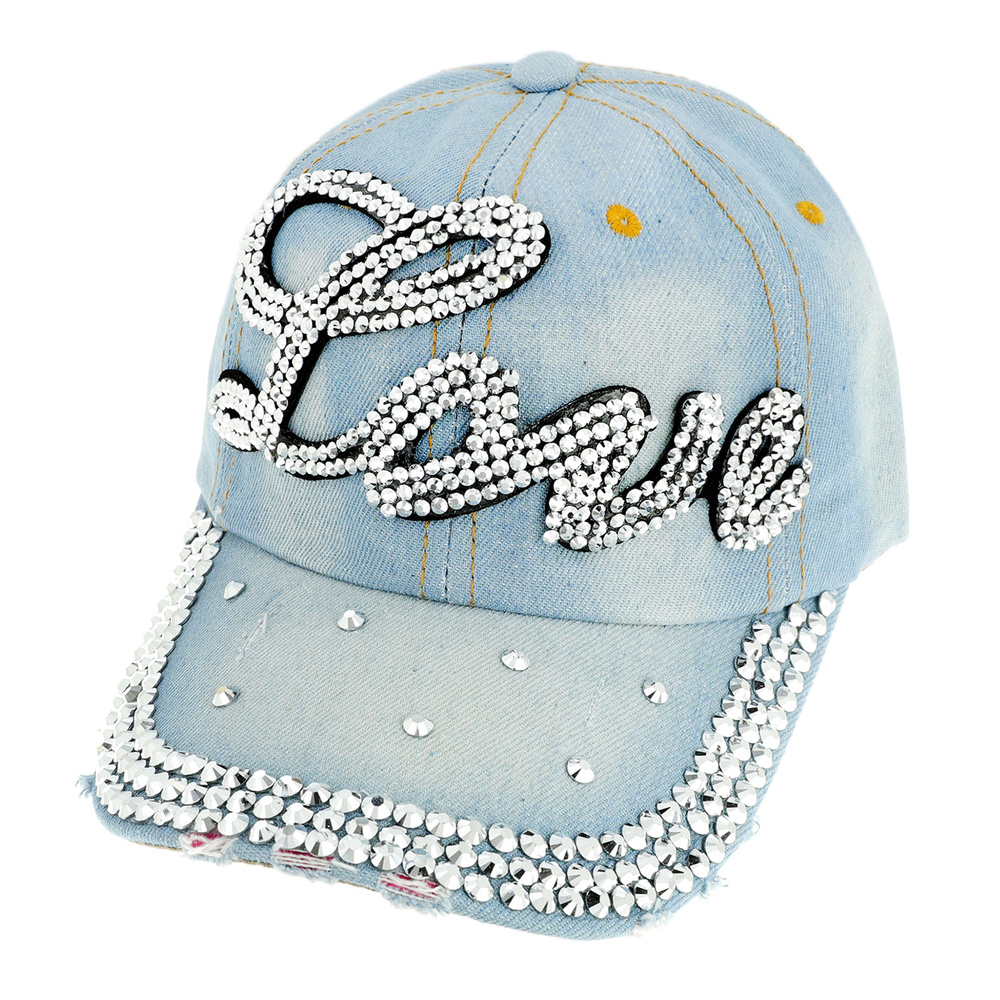 Cursive Love Rhinestone Distressed Denim Fashion Baseball Cap