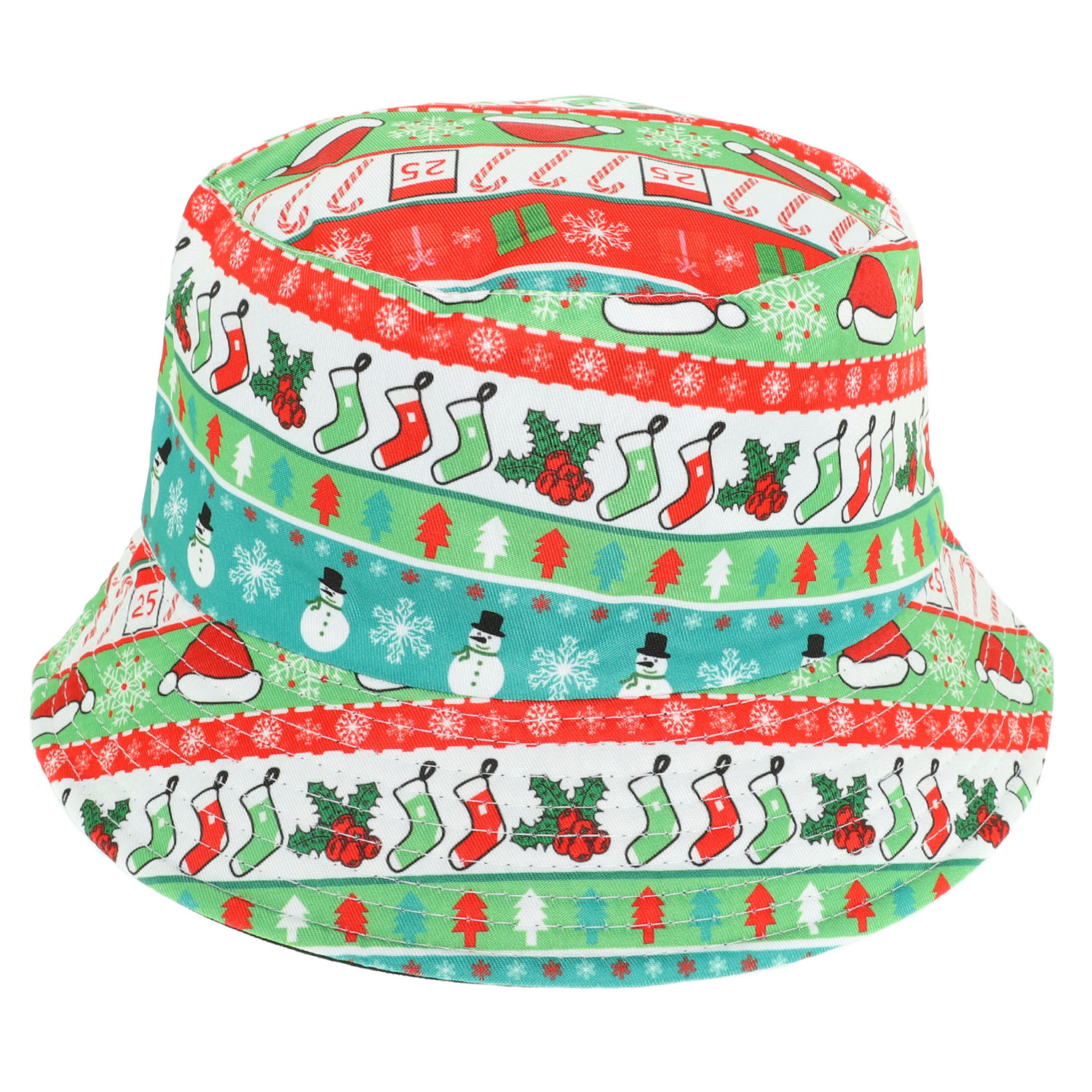 CHRISTMAS THEME BUCKET HATS IN SANTA STOCKING CANDY CANE PRESENT AND HOLIDAY LETTERING DESIGN OPTIONS