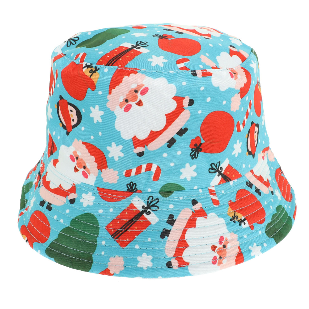 CHRISTMAS THEME BUCKET HATS IN SANTA SNOWMAN PRESENT TREE AND HOLIDAY PATTERN PRINT DESIGN OPTIONS